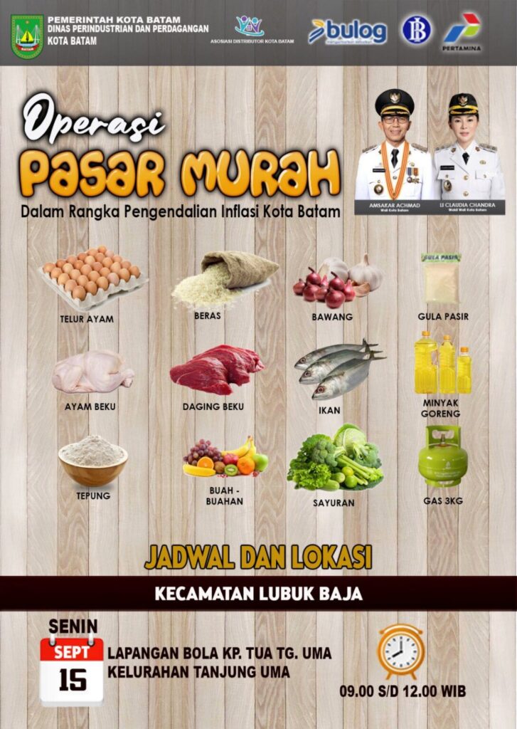 Pada Rabu, 17 September 2025, Operasi Pasar Murah berlangsung di Lapangan Parkir Masjid Sultan Mahmud Riayat Syah, Tanjung Uncang, Kecamatan Batu Aji, serta Lapangan Bola Kampung Tua Tembesi, Kecamatan Sagulung.