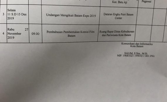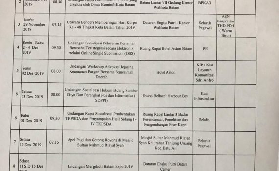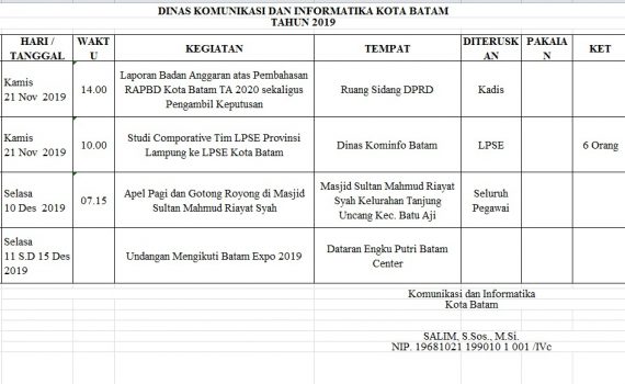 Jadwal Tentatif Dinas Kominfo Kota Batam, Rabu 20 November 2019