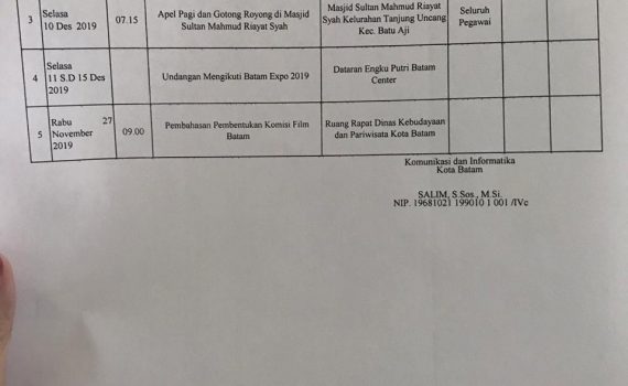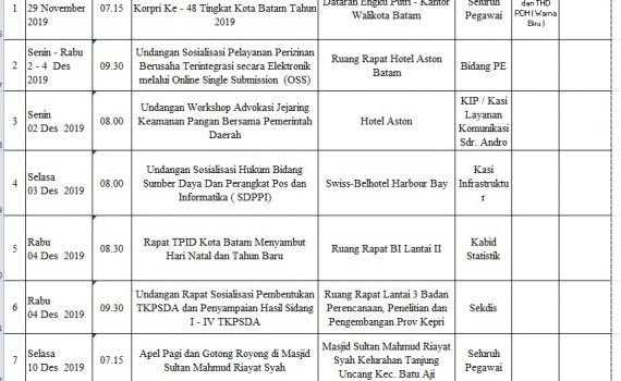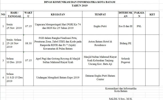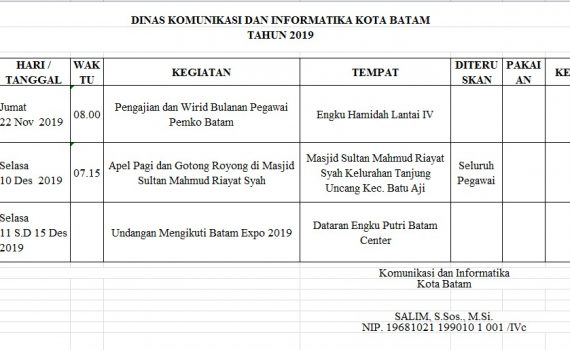 Jadwal Tentatif Dinas Kominfo Kota Batam, Jum’at 29 November 2019