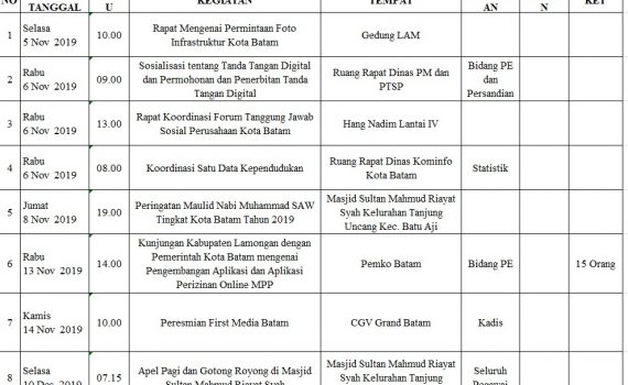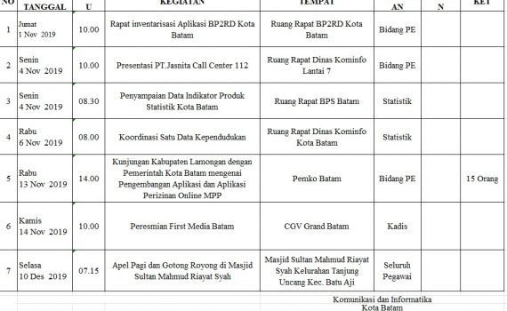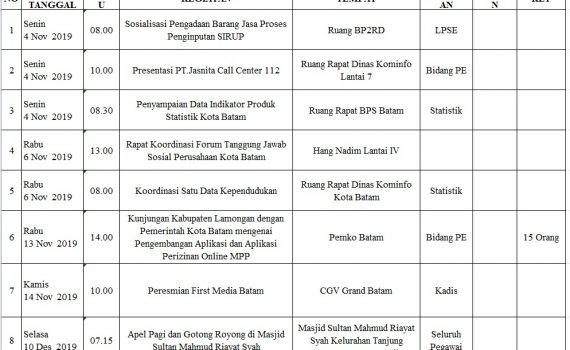 Jadwal Tentatif Dinas Kominfo Kota Batam Jum’at 1 November 2019