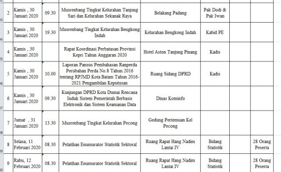 Jadwal Tentatif Dinas Kominfo Kota Batam, Jum’at 31 Januari 2020