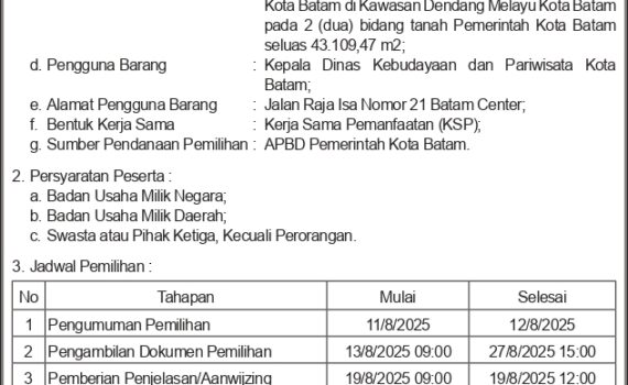 Tim Panitia Pemilihan Mitra Kerja Sama Pemanfaatan (KSP) Barang Milik Daerah Kota Batam akan melaksanakan Pemilihan Mitra Kerja Sama Pemanfaatan (KSP) Lahan Kawasan Dendang Melayu Kota Batam