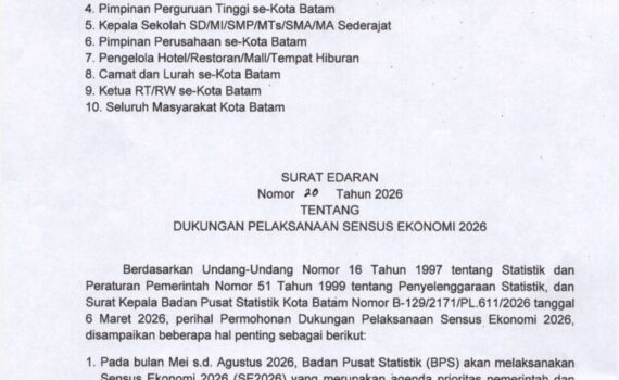 Diskominfo Batam – Pemerintah Kota (Pemko) Batam resmi menerbitkan Surat Edaran Wali Kota Batam (SE) Nomor 20 Tahun 2026 tentang Dukungan Pelaksanaan Sensus Ekonomi 2026 (SE2026). Langkah ini merupakan bentuk komitmen […]