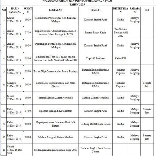 Telah Terbit 20 Desember 2019 Jadwal Tentatif Dinas Kominfo Kota Batam, Sabtu,Minggu & Senin Tanggal 21,22,23 Desember 2019 Bagikan: