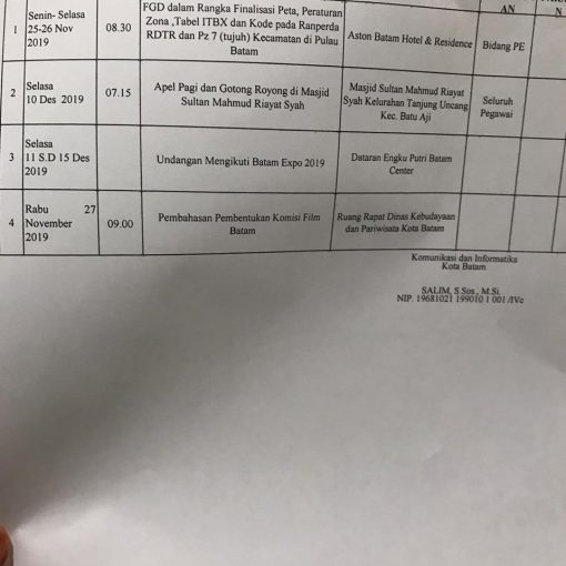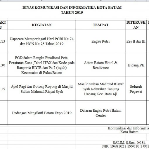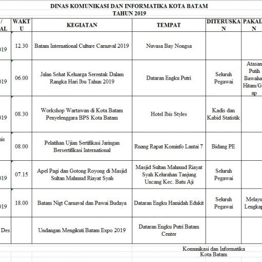 Telah Terbit 20 Desember 2019 Jadwal Tentatif Dinas Kominfo Kota Batam, Sabtu,Minggu & Senin Tanggal 21,22,23 Desember 2019 Bagikan: