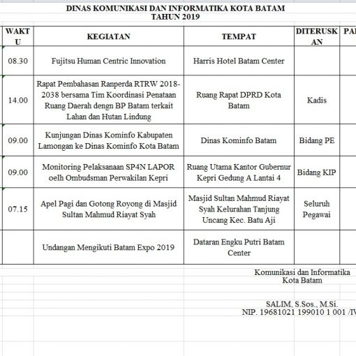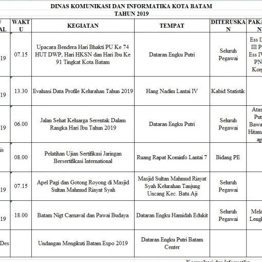 Telah Terbit 21 Februari 2020 Jadwal Tentatif Dinas Kominfo Kota Batam, Sabtu,Minggu & Senin 22,23 & 24 Februari 2020 Bagikan: