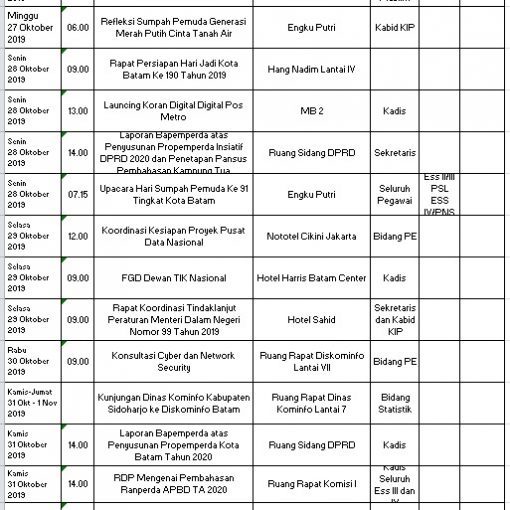 Telah Terbit 25 Oktober 2019 Jadwal Tentatif Dinas Kominfo Kota Batam Jum’at 25 Oktober 2019 Bagikan:
