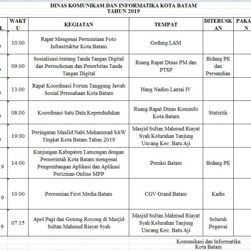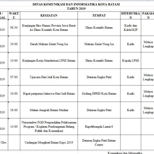 Telah Terbit 5 November 2019 Jadwal Tentatif Dinas Kominfo Kota Batam, Selasa 5 November 2019 Bagikan: