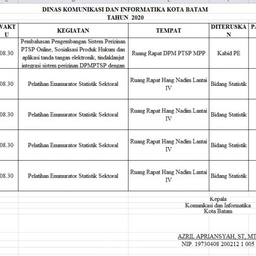 Telah Terbit 24 Januari 2020 Jadwal Tentatif Dinas Kominfo Kota Batam, Jum’at 24 Januari 2020 Bagikan: