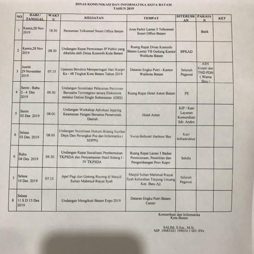 Telah Terbit 22 November 2019 Jadwal Tentatif Dinas Kominfo Kota Batam, Jum’at 22 November 2019 Bagikan: