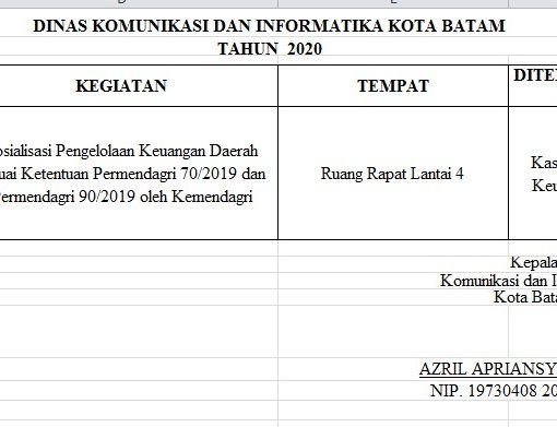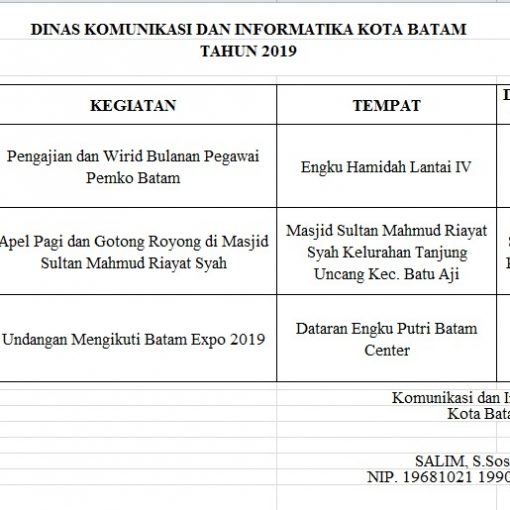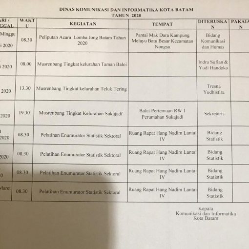Telah Terbit 22 November 2019 Jadwal Tentatif Dinas Kominfo Kota Batam, Jum’at 22 November 2019 Bagikan: