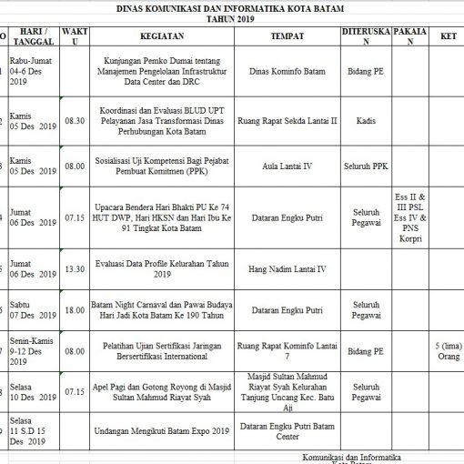 Telah Terbit 9 Desember 2019 Jadwal Tentatif Dinas Kominfo Kota Batam, Selasa 10 Desember 2019 Bagikan: