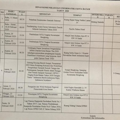 Telah Terbit 19 Februari 2020 Jadwal Tentatif Dinas Kominfo Kota Batam, Rabu 19 Februari 2020 Bagikan: