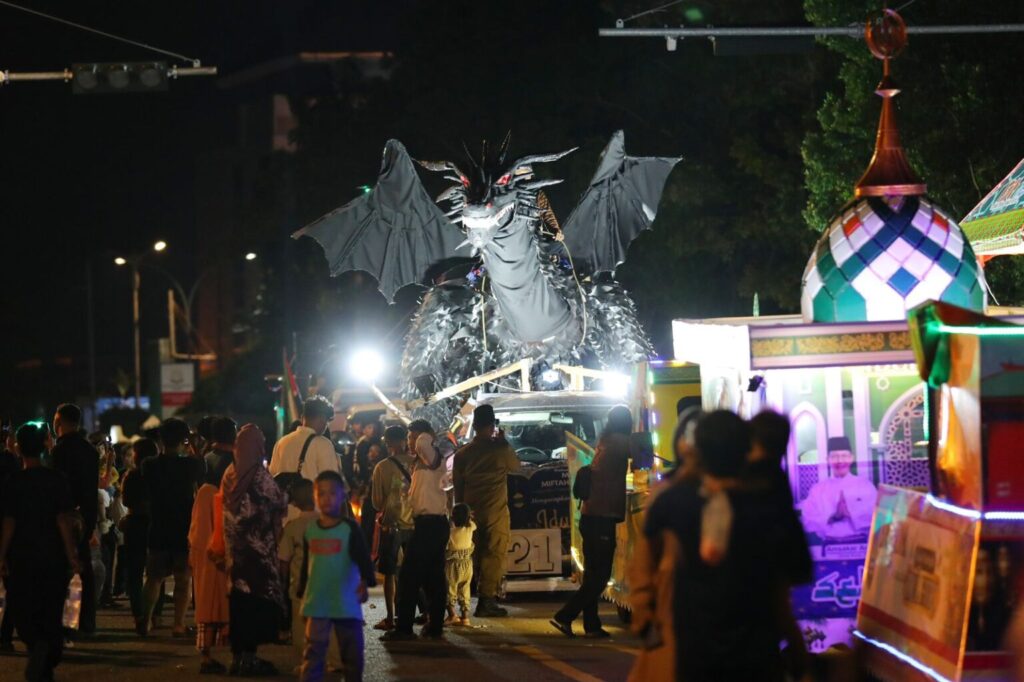 Dari replika masjid yang megah, kapal yang sarat makna perjalanan, hingga sosok naga hitam yang atraktif, seluruh peserta tampil memukau. Warga pun memadati sisi jalan sejak titik awal di Dataran Engku Putri, larut dalam suasana syukur menyambut Hari Raya Idulfitri 1447 Hijriah.