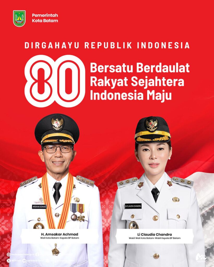 Pemerintah Kota Batam mengucapkan selamat Hari Ulang Tahun Republik Indonesia 2025. Semoga semangat persatuan senantiasa memperkokoh langkah kita menuju Indonesia Maju. Dirgahayu Republik Indonesia ke-80.