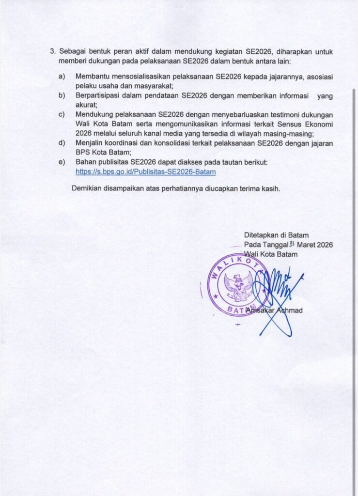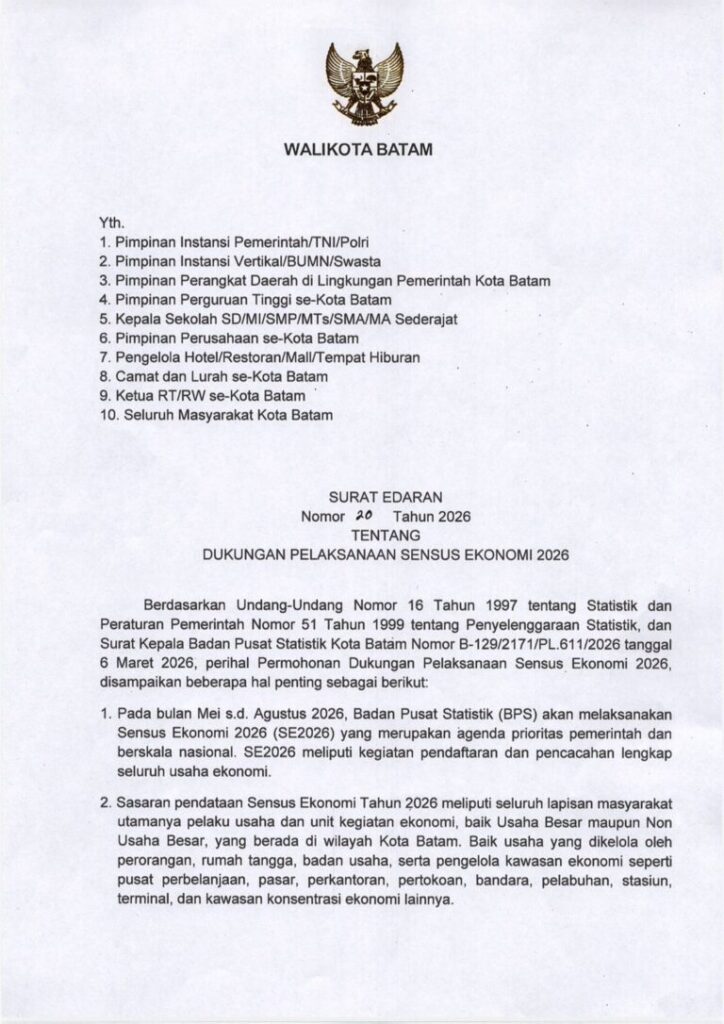 Diskominfo Batam – Pemerintah Kota (Pemko) Batam resmi menerbitkan Surat Edaran Wali Kota Batam (SE) Nomor 20 Tahun 2026 tentang Dukungan Pelaksanaan Sensus Ekonomi 2026 (SE2026). Langkah ini merupakan bentuk komitmen Pemerintah Daerah dalam menyukseskan agenda prioritas nasional yang dilaksanakan oleh Badan Pusat Statistik (BPS).