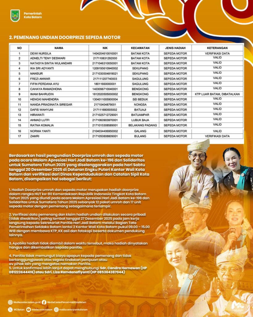 Pemerintah Kota Batam mengumumkan daftar Pemenang Undian Doorprize Sepeda Motor dan Umroh dalam rangka HUT ke-80 RI pada acara Malam Apresiasi Hari Jadi Batam ke-196 dan Solidaritas untuk Sumatera Tahun 2025, yang diselenggarakan pada Sabtu, 20 Desember 2025, di Dataran Engku Puteri, Batamcentre.
