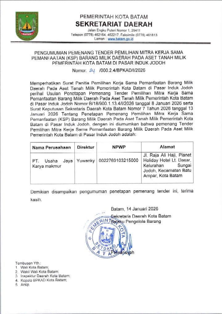 Pemerintah Kota Batam telah menetapkan pemenang Kerja Sama Pemanfaatan (KSP) Pasar Induk Jodoh melalui tahapan seleksi yang transparan, objektif, dan sesuai ketentuan peraturan perundang-undangan.