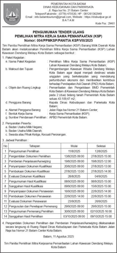 Tim Panitia Pemilihan Mitra Kerja Sama Pemanfaatan (KSP) Barang Milik Daerah Kota Batam akan melaksanakan Pemilihan Mitra Kerja Sama Pemanfaatan (KSP) Lahan Kawasan Dendang Melayu Kota Batam