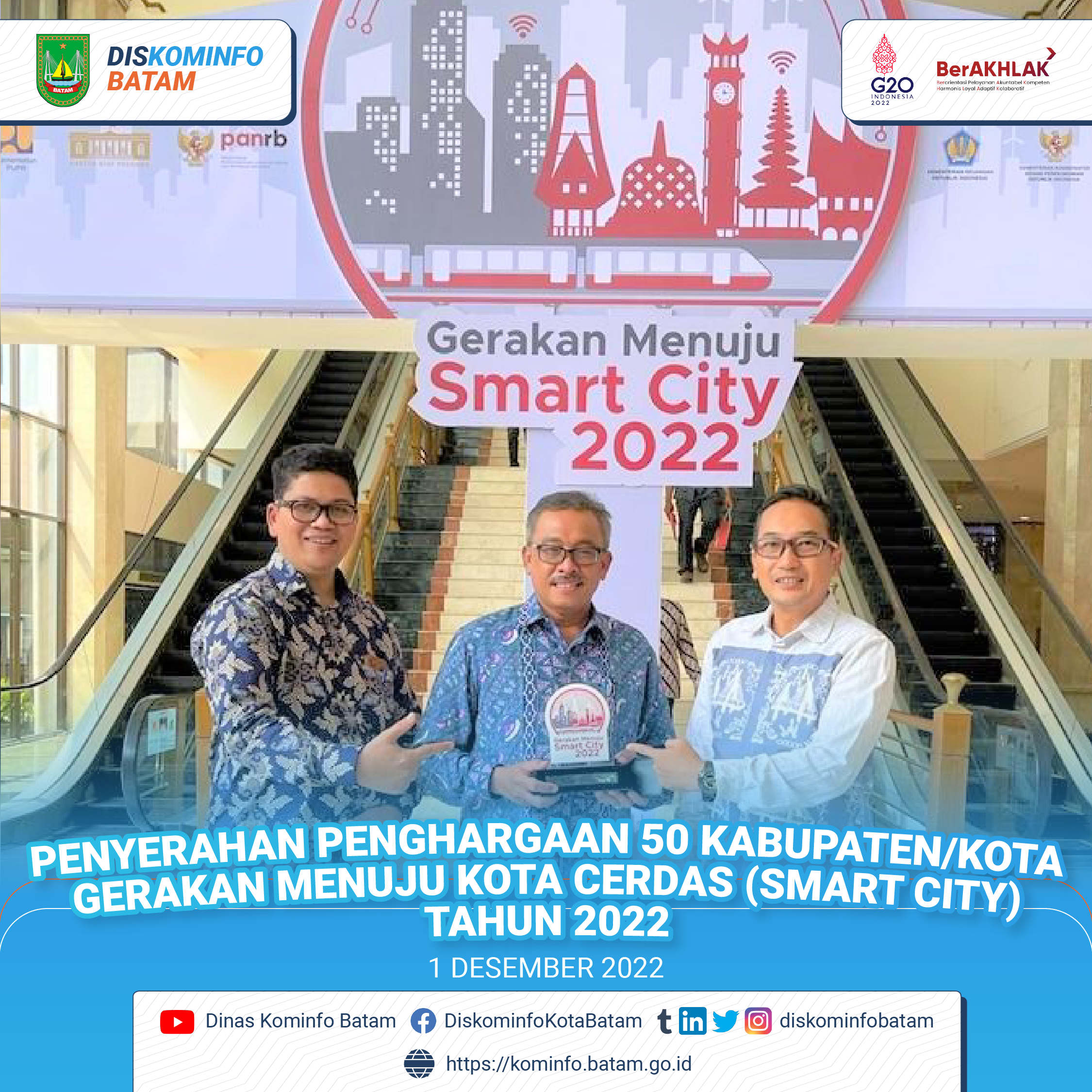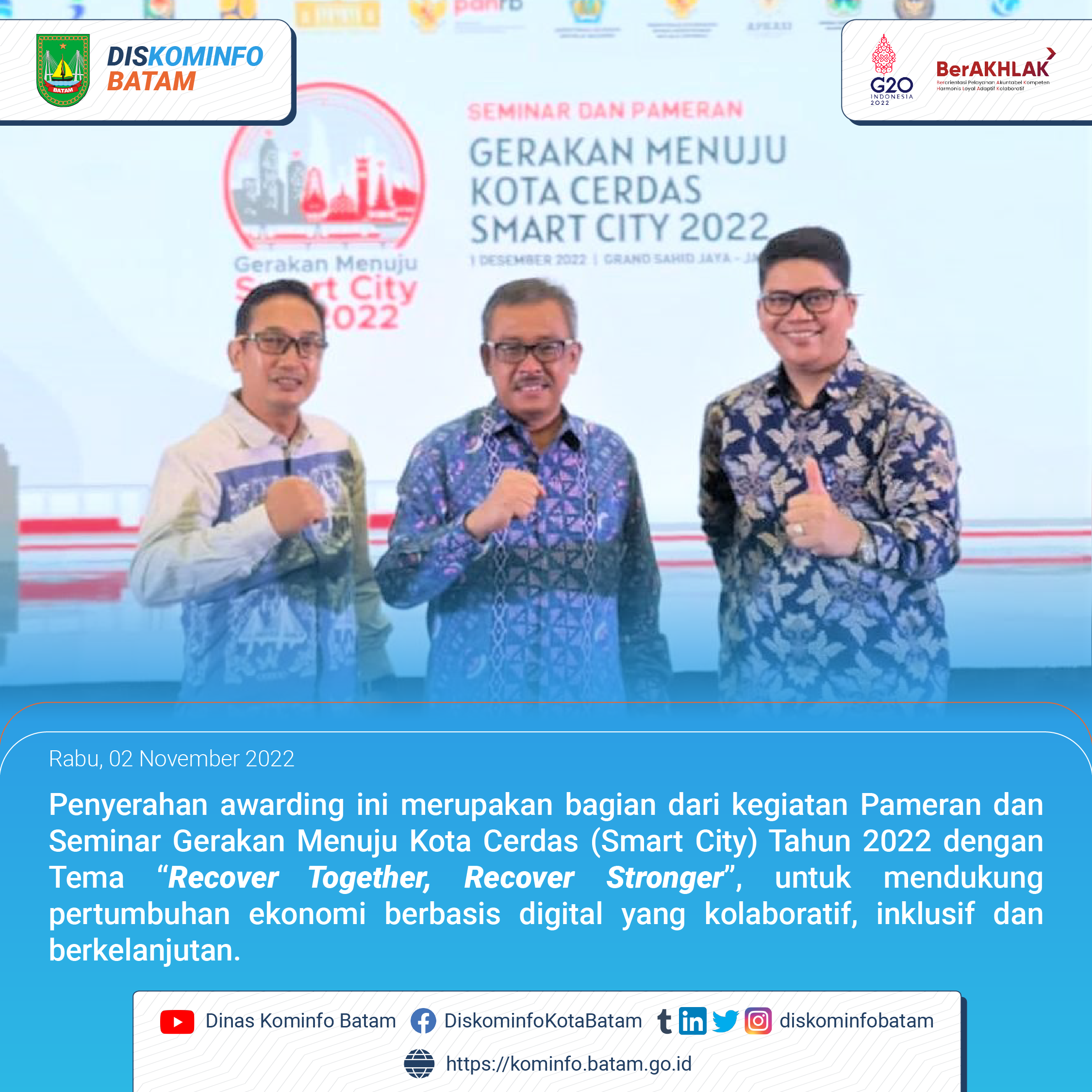 Pemerintah Kota Batam dalam kesempatan ini diwakili oleh Sekretaris Daerah Kota Batam didampingi oleh Kepala Dinas Kominfo Kota Batam dan Kabag Organisasi Setdako Batam menghadiri Seminar dan Pameran Gerakan Menuju Kota Cerdas (Smart City) Tahun 2022 yang diselenggarakan Kementerian Komunikasi dan Informatika Republik Indonesia pada tanggal 30 November – 1 Desember 2022 di Grand Sahid Hotel Jakarta.