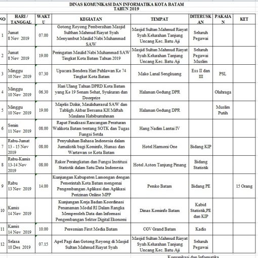 Telah Terbit 8 November 2019 Jadwal Tentatif Dinas Kominfo Kota Batam, Jumat 8 November 2019 Bagikan:
