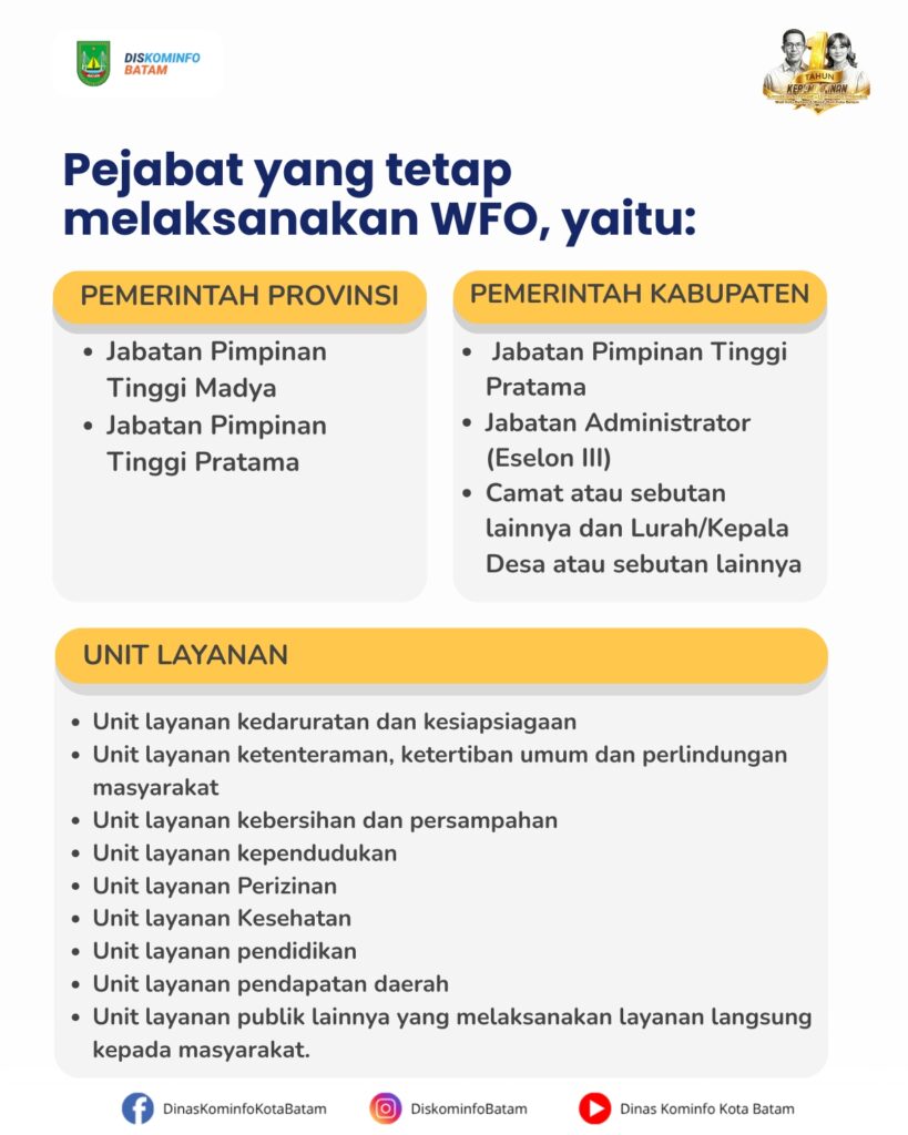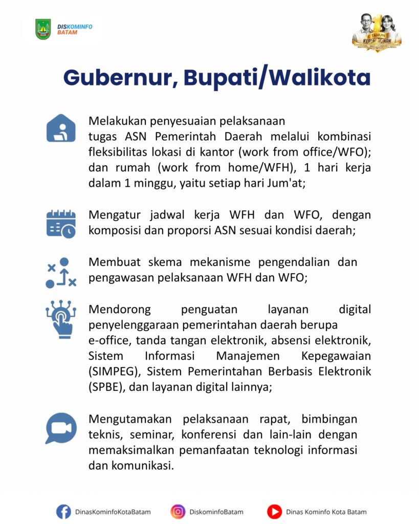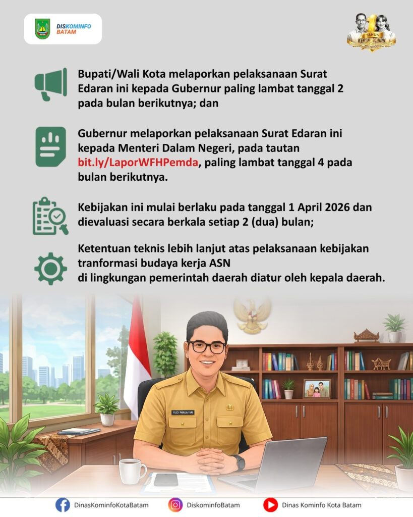 Transformasi budaya kerja Aparatur Sipil Negara (ASN) di daerah terus diperkuat guna mewujudkan birokrasi yang adaptif, efisien, dan berorientasi pada pelayanan publik. Pemerintah daerah didorong menerapkan pola kerja fleksibel, baik Work From Office (WFO) maupun Work From Home (WFH), secara terukur tanpa mengurangi kualitas layanan kepada masyarakat.